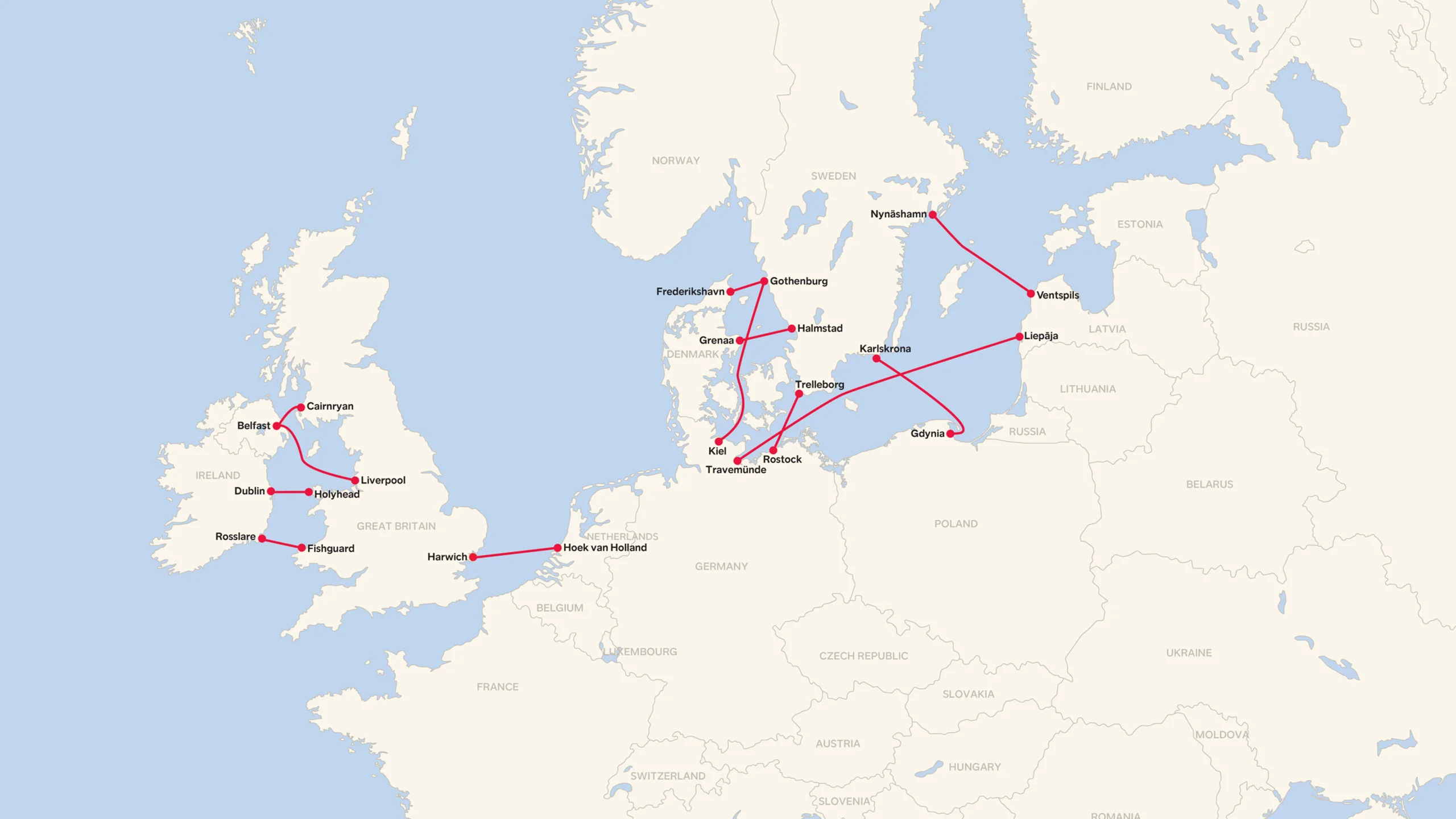 Our extensive route network is one of Europe's largest, linking key ports, road and rail connections across northern Europe and the Mediterranean. Every year we transport more than 6.5 million passengers, 1.8 million cars and 2.1 million freight units. The countries where Stena Line offers services to are Sweden, Denmark, Germany, Poland, Latvia, Netherlands, Great Britain, Ireland, Spain, and Morocco.